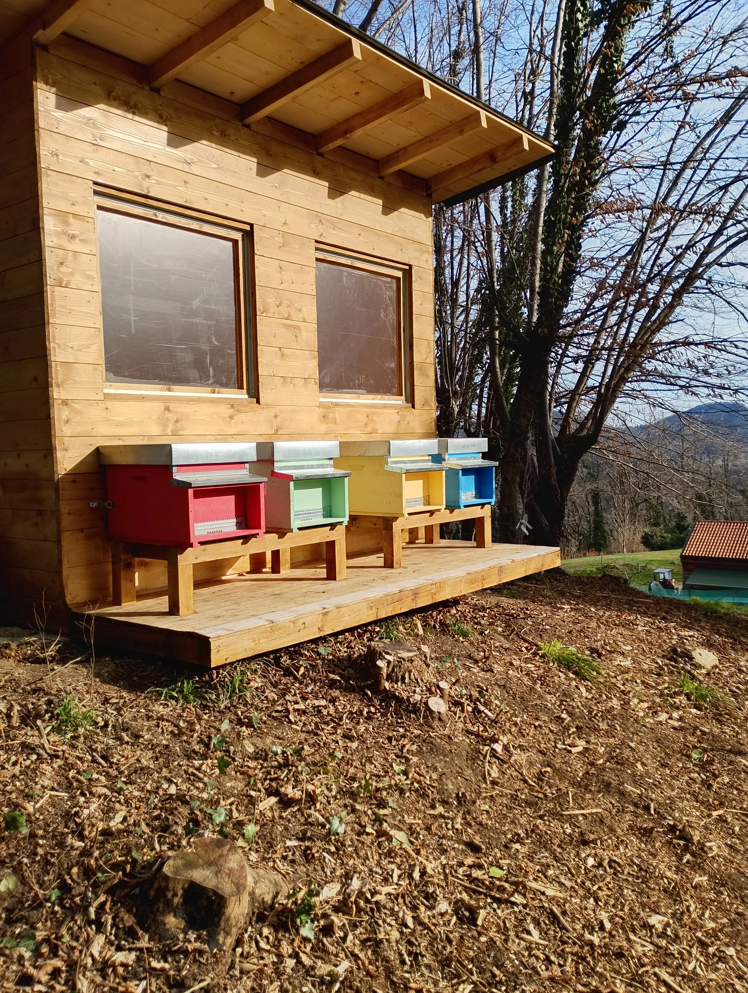 • Sicurezza e Comfort: Potrai osservare il lavoro instancabile delle api attraverso pareti protette, godendoti il calore del legno e la vista sui nostri Colli Asolani.